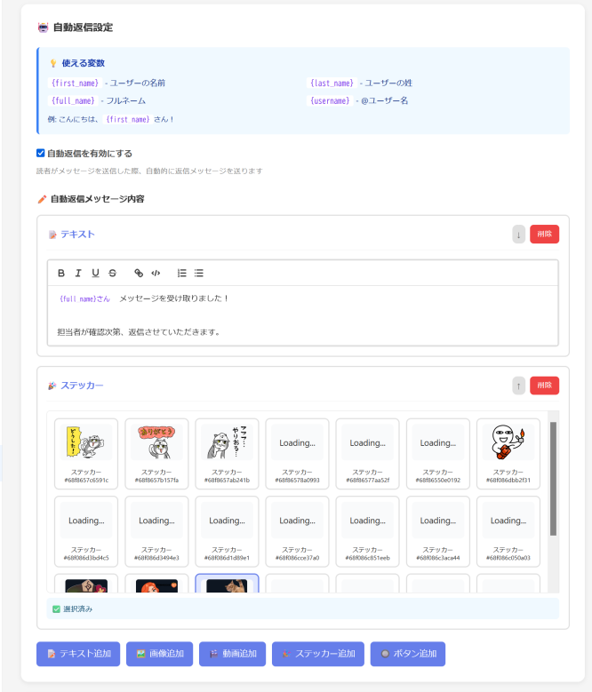 - ボタンメニュー、画像、動画、名前の差し込み機能