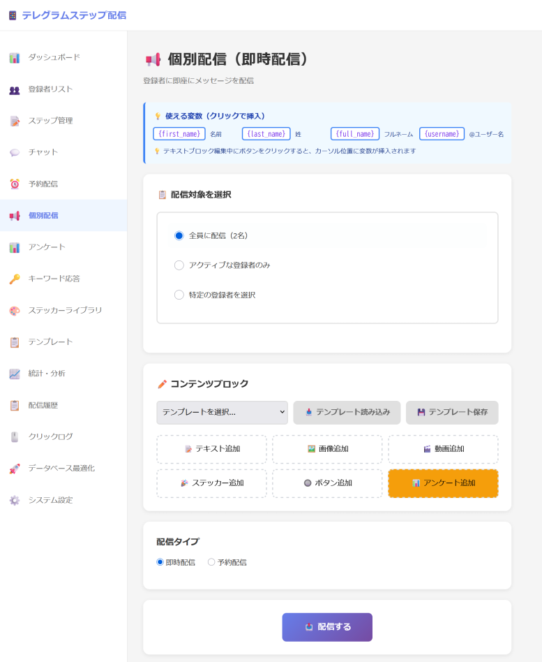 ステップ配信以外にも個別配信機能を実装しています。タグで絞り込んだユーザーにも配信が可能です。