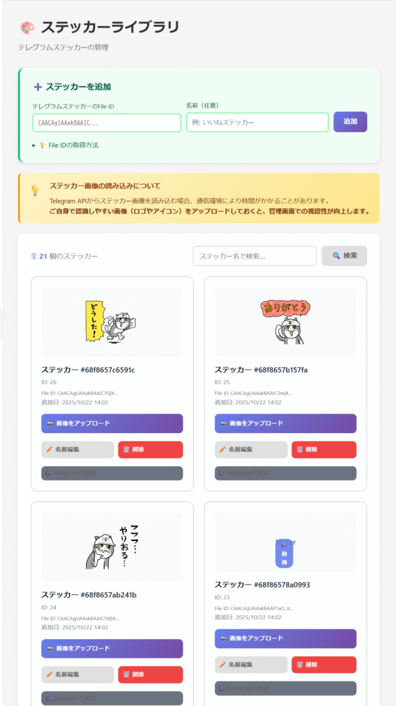 手動登録あるいは管理者アカウント経由でステッカーを送信すると管理画面から使えるようになります。