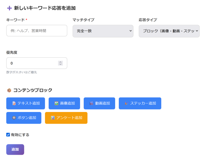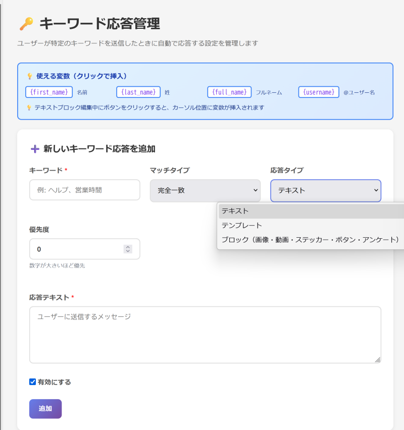ユーザーが特定のキーワードを入力、あるいはアンケート回答でクリックした場合に送信するメッセージを設定できる機能です。